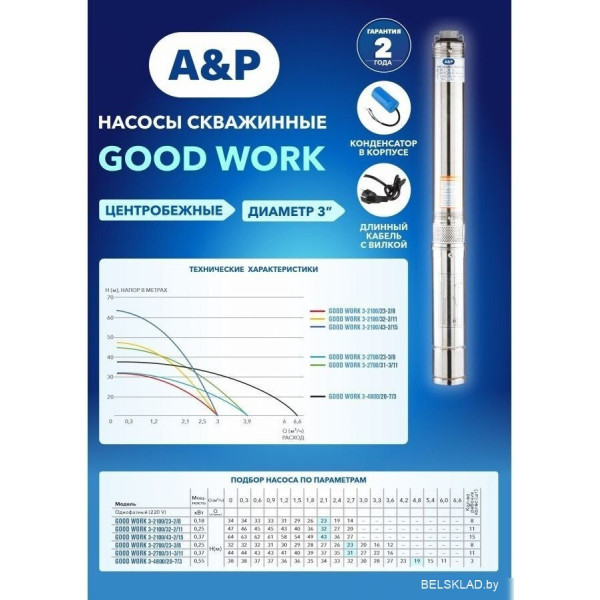 A&P Good Work 3-4800/20-7/3 - скважинный, 6 м?/ч, напор 38 м. Оригинальный A&P от производителя подтверждённый сертификатом соответствия.