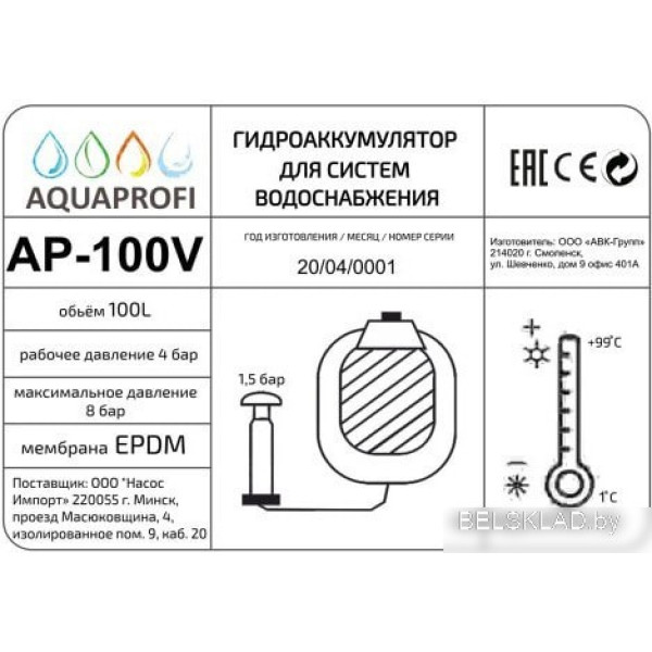Обратите внимание: на сайте BelSklad.by все цены на Гидроаккумуляторы и расширительные баки указаны с НДС, возможен наличный и безналичный расчет. При заказе обязательно сообщайте код товара: 2105782.