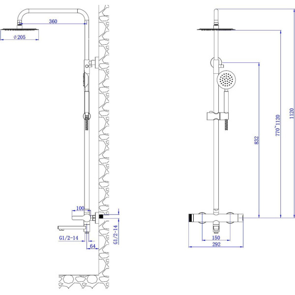 Комплектация | верхний душ, штанга, ручной душ (лейка), держатель лейки, шланг, смеситель |