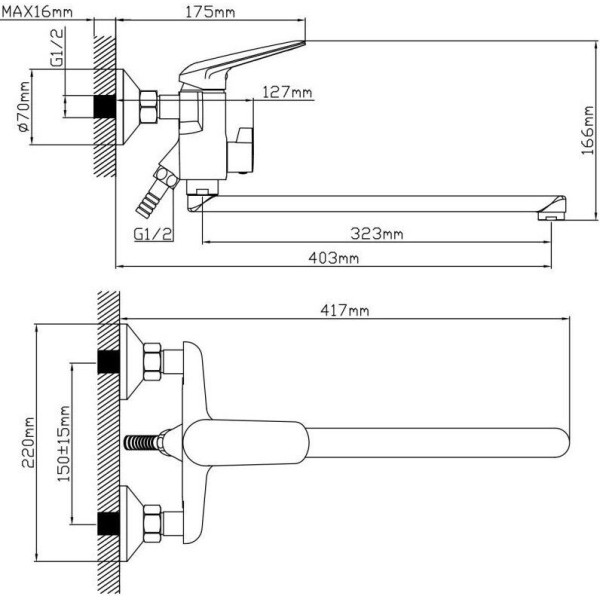 | Длина (вылет) излива | 323 мм |