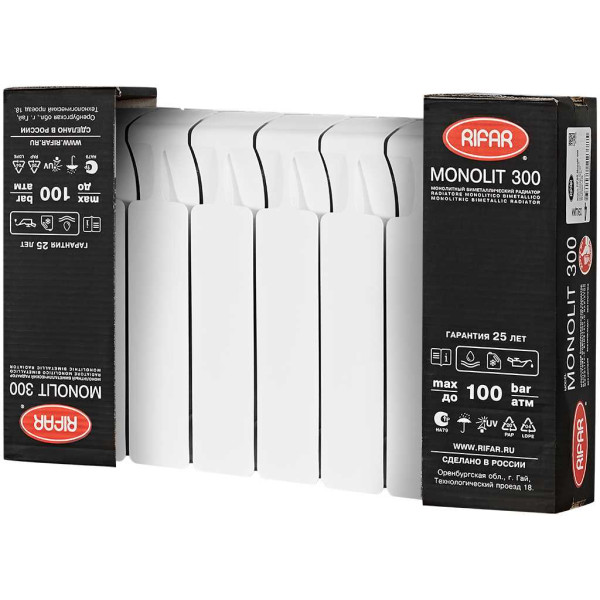 Радиатор биметаллический RIFAR MONOLIT 300 с боковым подключением отвечает всем требованиям прочности оборудования, к коррозионной стойкости, долгой эксплуатации, эффективной поддержки нужного температурного режима и др. В модели MONOLIT 300 нет ниппельного соединения. Секции отопительного прибора соединены между собой при помощи контактно-стыковой сварки. Рифар Монолит 300 с боковым подключением является новым, запатентованным прибором отопления от компании «РИФАР» с высокими техническими характеристиками, которые отвечают суровым условиям эксплуатации в России. В отличие от биметаллических и алюминиевых секционных радиаторов, внутри данного радиатора MONOLIT 300 теплоноситель перемещается по каналам из стали, соединенные при помощи специальной технологии сварки в единую конструкцию, которую нельзя разобрать, из за чего в приборе нет участков, опасных для появления протечек. Радиатор обладает очень высокой надежностью и теплоотдачей, что достигается благодаря развитой геометрии теплопередающих поверхностей из алюминиевого сплава. . Оригинальный Rifar от производителя подтверждённый сертификатом соответствия.