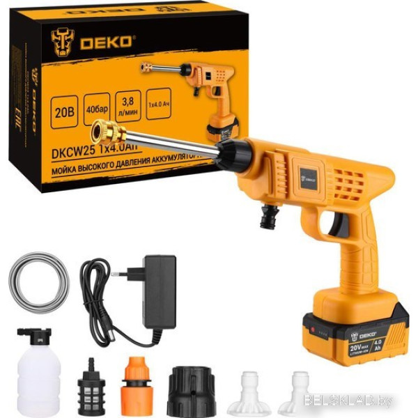 Deko DKCW25 063-4490 (с 1-им АКБ) - 228 л/ч, максимальное рабочее давление: 30 Бар, максимальная температура на входе: 40 °C, длина шланга: 5 м. Оригинальный Deko от производителя подтверждённый сертификатом соответствия.