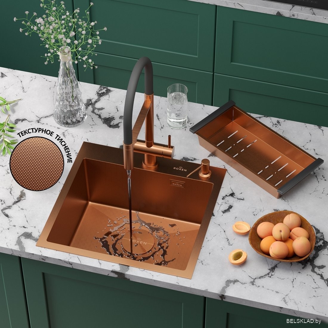 Кухонная мойка Roxen Simple 560220-50BR-V бронза/текстурная PVD покрытие (с коландером и дозатором)