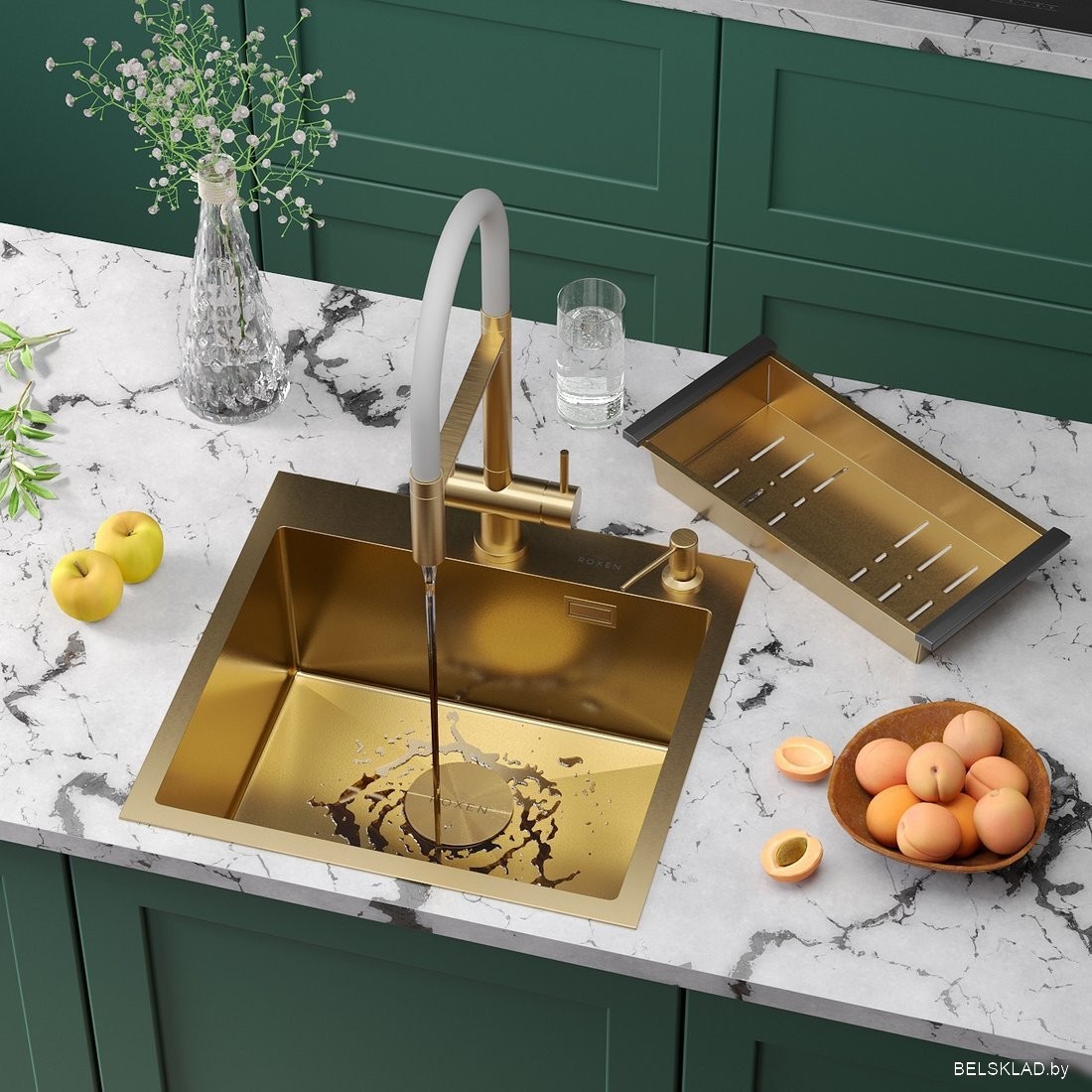Кухонная мойка Roxen Simple 560220-60G-GR золото/текстурная PVD покрытие (с коландером и дозатором)