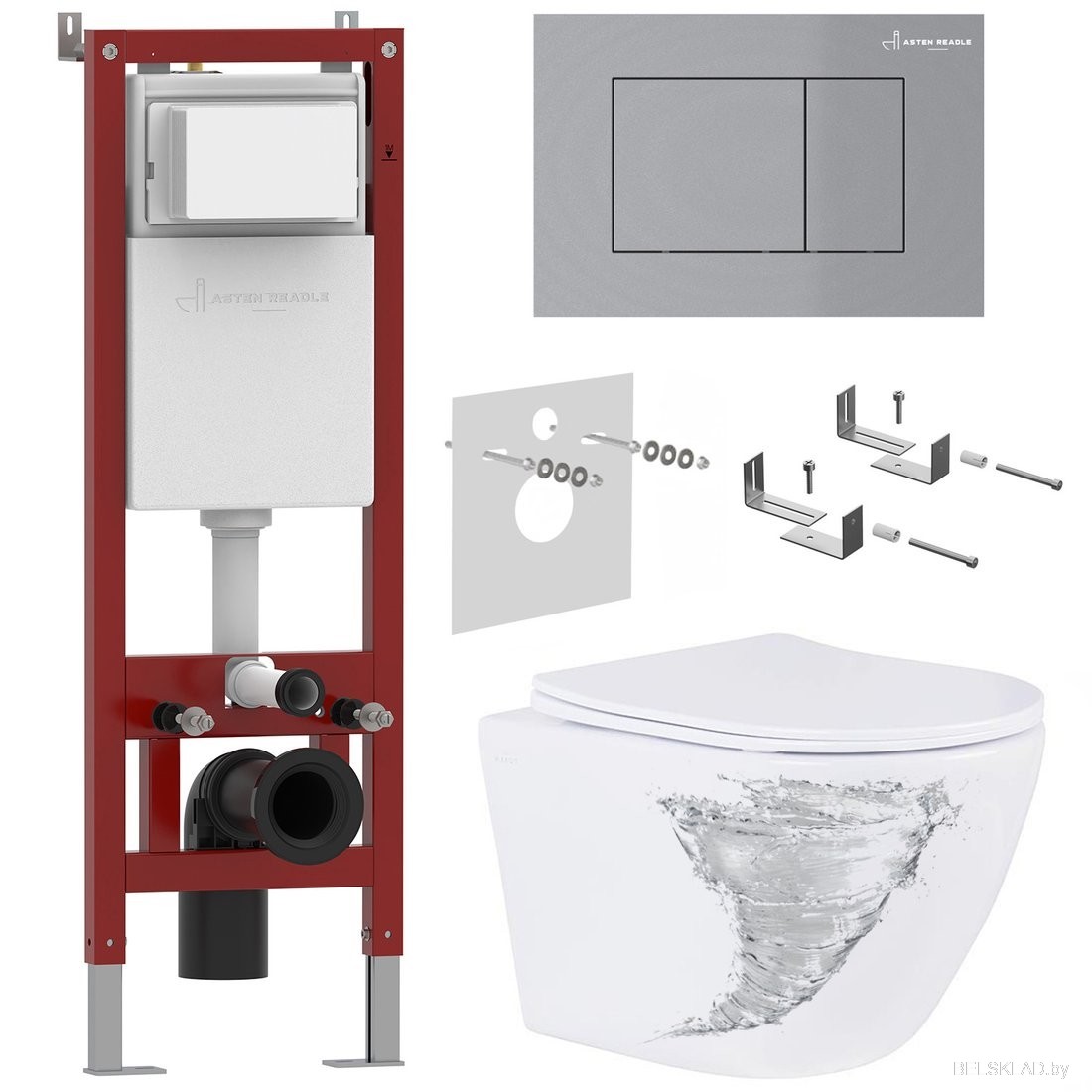 Унитаз подвесной Roxen Antares Tornado в комплекте с инсталляцией Asten Readle Zentralmodul с кнопкой сатин (хром матовый)