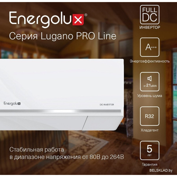 Energolux Lugano Pro Line inverter SAS09DL2-AI/SAU09DL2-AI - сплит-система, инвертор, мощность охлаждения 2.73 кВт, мощность обогрева 3.14 кВт, обслуживаемая площадь 25 м?, шум 21.5-37 дБ, Wi-Fi: поддерживается, модуль приобретается отдельно, ионизатор. Оригинальный Energolux от производителя подтверждённый сертификатом соответствия.