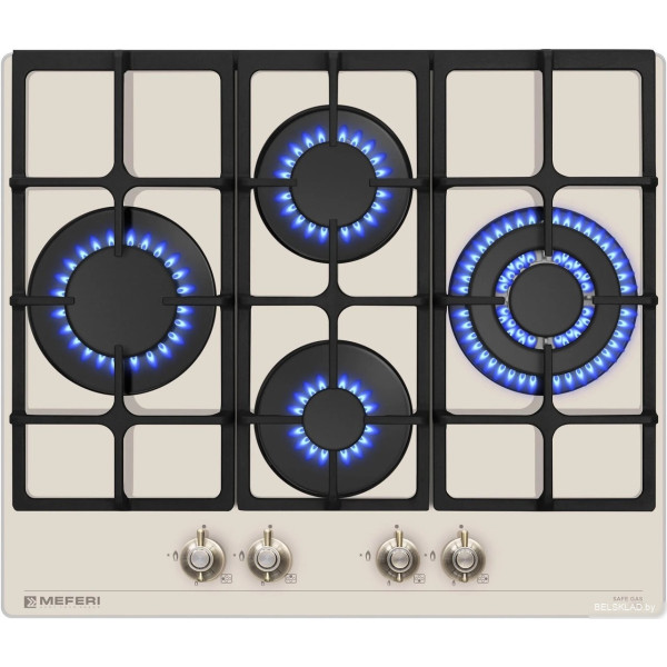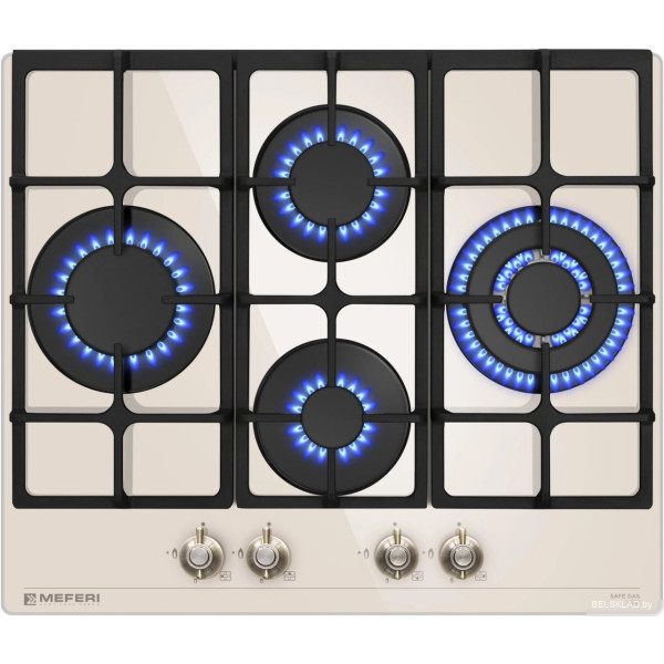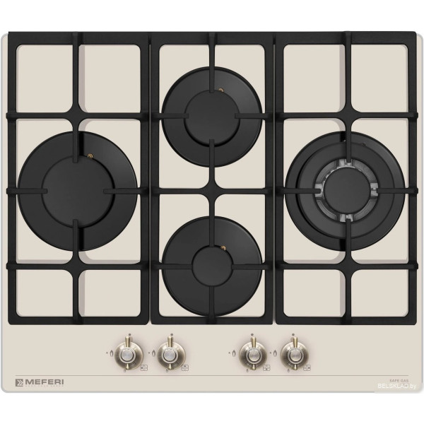 Meferi MGH604BG Glass Retro - газовая на 4 конфорки, закаленное стекло, мощность: 9550 Вт, автоматический электроподжиг, газ-контроль, решетки: чугун, независимая установка, размеры (ШхГ): 60x51 см. Оригинальный Meferi от производителя подтверждённый сертификатом соответствия.