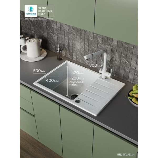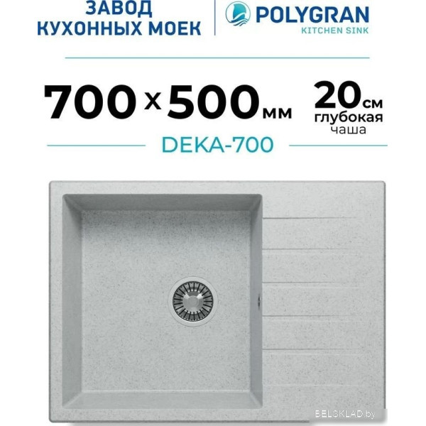 Polygran Deka 700 (светло-серый) - врезная на столешницу, искусственный камень, размеры: 50x70 см, глубина чаши: 20 см, в шкаф шириной от 50 см. Оригинальный Polygran от производителя ООО «Полигран-М» РФ г. Москва Ленинский пр-т д. 45 подтверждённый сертификатом соответствия.