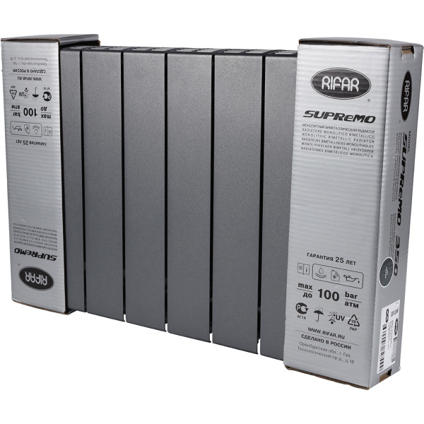 RIFAR SUPReMO 350 (8 секций) радиатор биметаллический боковое подключение (Цвет ТИТАН) - Радиатор RIFAR SUPReMO 350, состоящий из восьми секций, имеет боковое подключение и выполнен в цвете “титан”. Произведен из высококачественного биметаллического сплава, отличается высокой теплоотдачей и подходит для установки в современных отопительных системах жилых и офисных помещений.. Оригинальный Rifar от производителя подтверждённый сертификатом соответствия.