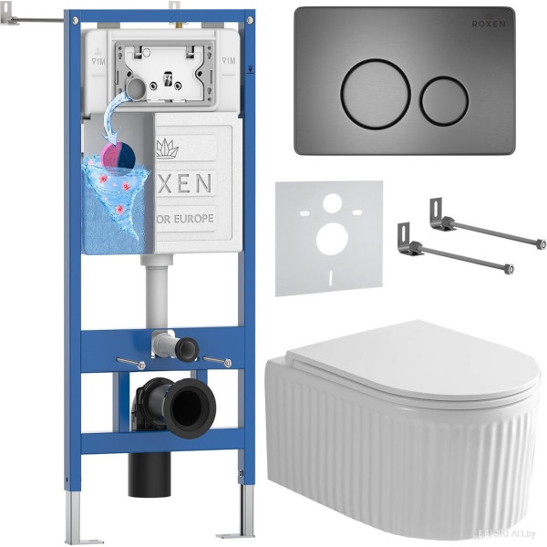 Roxen Antares Tornado Long в комплекте с инсталляцией StounFix Dual Fresh 6 в 1 868439 (кнопка: брашированное золото матовая) - подвесной, конструкция: без бачка, задний подвод воды, горизонтальный выпуск, двухрежимный слив, с сиденьем, безободковый. Оригинальный Roxen от производителя подтверждённый сертификатом соответствия.
