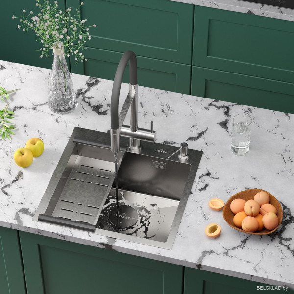 Roxen Simple 560220-50-V сатин/текстурная (с коландером и дозатором) - врезная на столешницу, нержавеющая сталь, фактура: с текстурой, размеры: 48x50 см, глубина чаши: 22 см. Оригинальный Roxen от производителя подтверждённый сертификатом соответствия.
