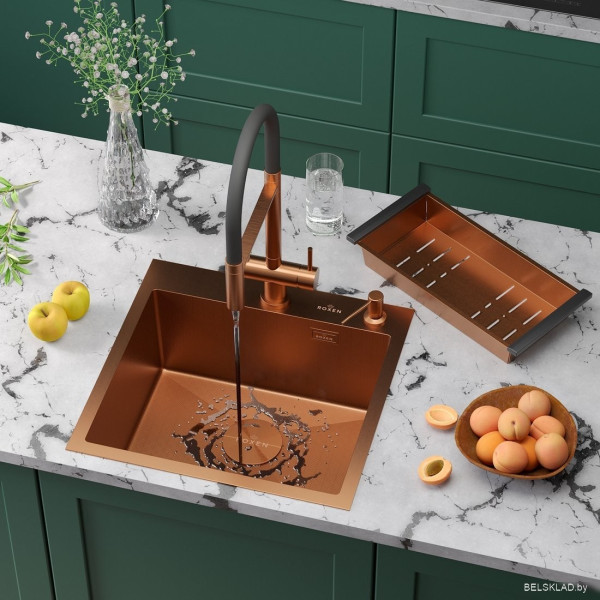 Roxen Simple 560220-50BR-GR бронза/текстурная PVD покрытие (с коландером и дозатором) - врезная на столешницу, нержавеющая сталь, фактура: с текстурой, размеры: 48x50 см, глубина чаши: 22 см. Оригинальный Roxen от производителя подтверждённый сертификатом соответствия.