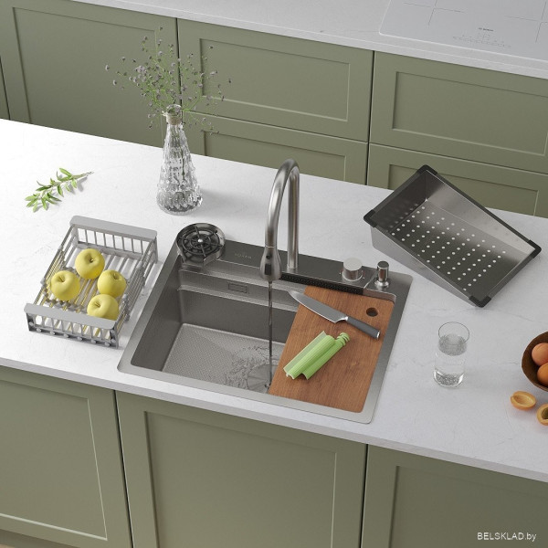 Комплектация | ?Смеситель ?Ринзер (омыватель стаканов) ?Доска разделочня ?Сифон ?Дозатор для моющих средств ?Коландер телескопический ?Коландер ?Корзинчатый вентиль с декоративной накладкой ?Комплект креплений к столешнице |
