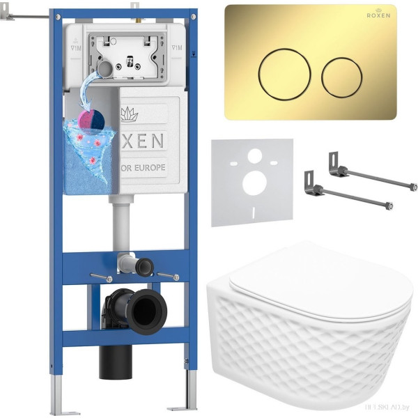 Roxen Vine Tornado в комплекте с инсталляцией StounFix Dual Fresh 6 в 1 868595 (кнопка: сатин матовая) - подвесной, конструкция: без бачка, задний подвод воды, горизонтальный выпуск, двухрежимный слив, с сиденьем, безободковый. Оригинальный Roxen от производителя подтверждённый сертификатом соответствия.