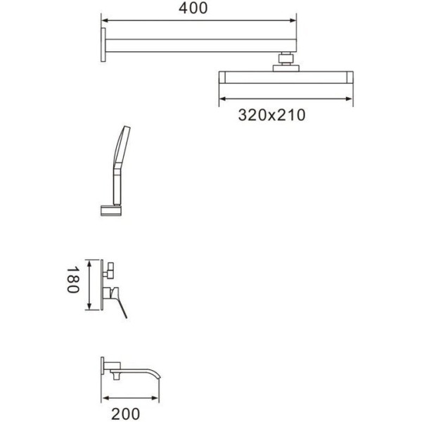 | Комплектация | верхний душ, ручной душ (лейка), держатель лейки, шланг, смеситель, излив для ванны, каскадный излив |