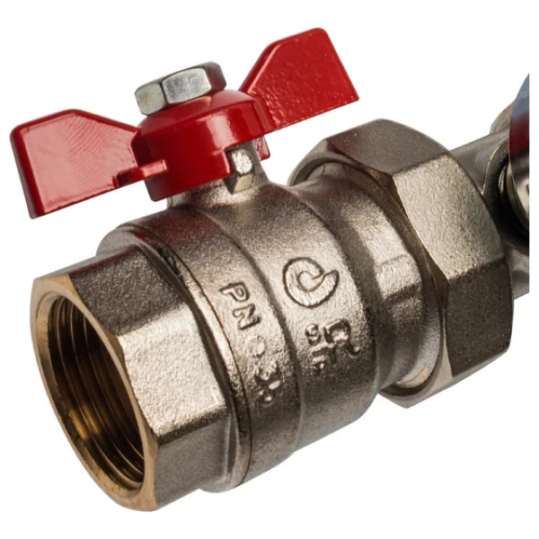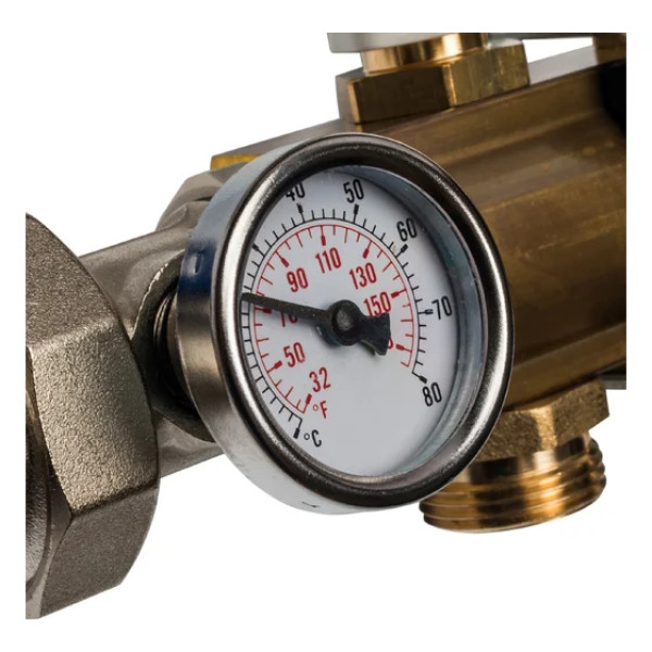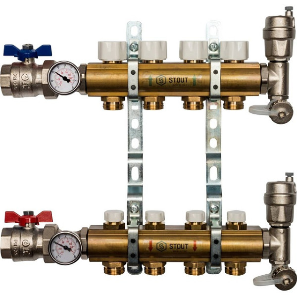 SMB 0468 000004 STOUT Распределительный коллектор из латуни без расходомеров 4 вых. - Распределительный коллекторный блок Stout (Стаут) SMB 0468 000004 отличается повышенной прочностью, так как выполнен из специального латунного сплава. В комплект поставки входят шаровые краны с разъёмными соединениями, термометры, запорно-регулирующие клапаны на кождом контуре и спускной кран.