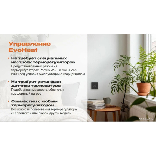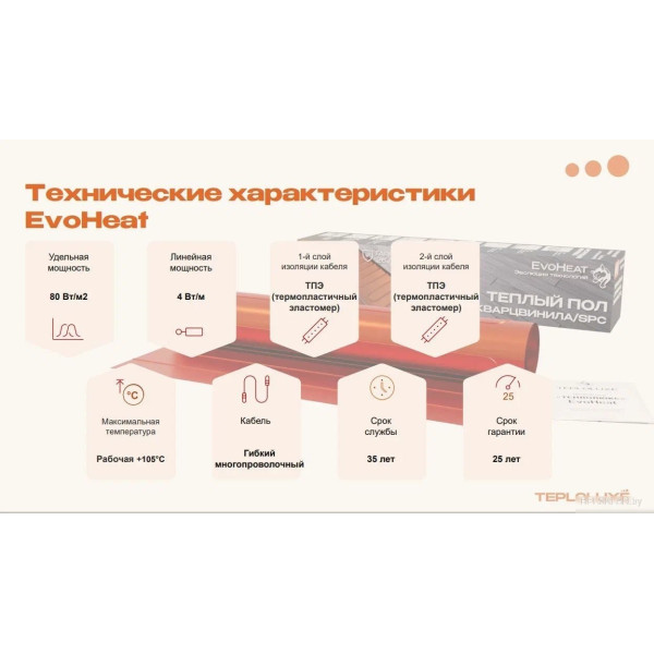 Важно! Информация о товаре «Теплолюкс EvoHeat 80 Вт/1.0 кв.м» и его характеристиках предоставлена для предварительного ознакомления и не является публичной офертой. Описание товара подготовлено по материалам, представленным на сайте производителя Теплолюкс, а также с использованием электронных и печатных каталогов. Производитель Теплолюкс оставляет за собой право вносить изменения в характеристики или комплектацию товара без предварительного уведомления. Для уточнения всех важных для Вас характеристик, сообщите консультанту артикул .
