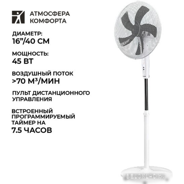 Timberk T-SF1602RC - напольный, мощность 45 Вт, 3 скорости, управление электронное, таймер, пульт ДУ, лопасти 40 см, питание: сеть. Оригинальный Timberk от производителя подтверждённый сертификатом соответствия.