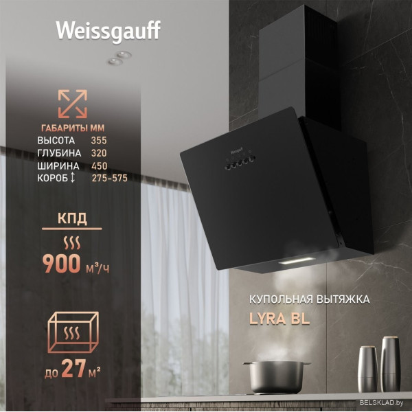 Weissgauff Lyra BL - конструкция наклонная, монтаж настенный, ширина 45 см, управление механическое/кнопочное, производительность мотора 900 м?/ч, цвет черный. Оригинальный Weissgauff от производителя Мidea Industriality, ShundeD istriсt,Е oshanC ity, GuangdоngP rovinсе5 28e11P, .R. China, Китaй подтверждённый сертификатом соответствия.