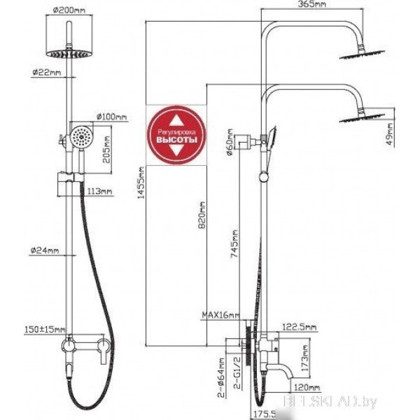 | Комплектация | верхний душ, штанга, ручной душ (лейка), держатель лейки, шланг, смеситель, излив для ванны |